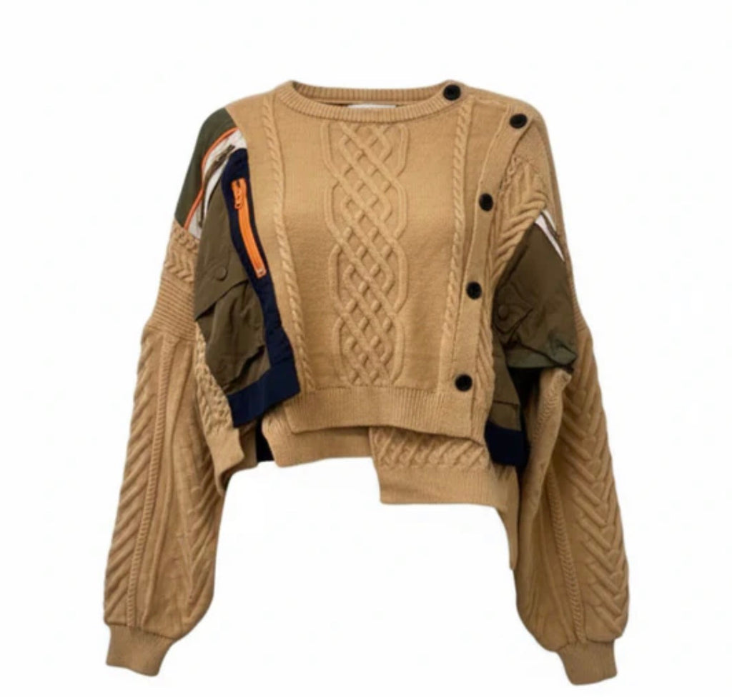 PATCHWORK CROPPED CABLE KNIT SWEATER-KHAKI